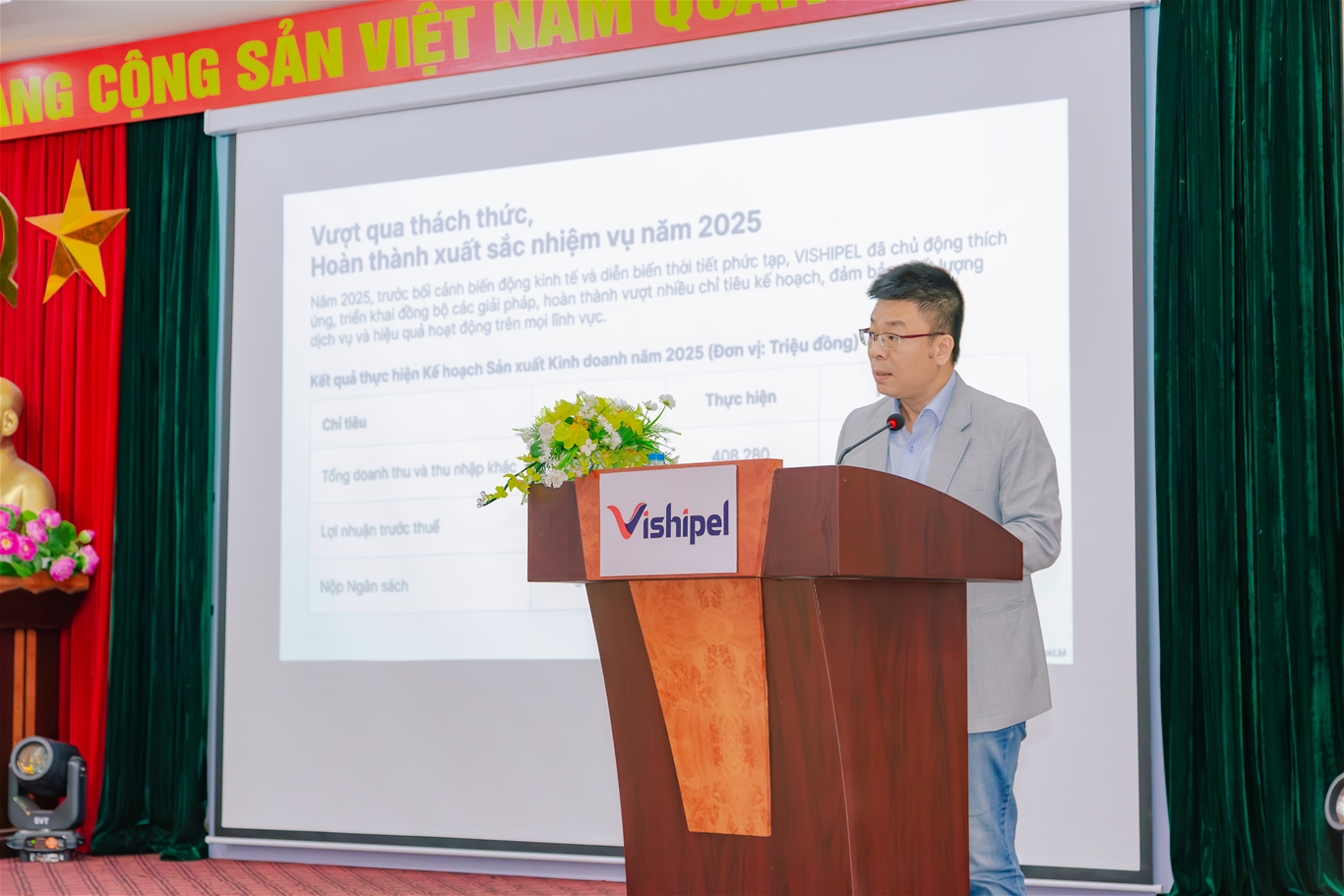 Năm 2025, trong bối cảnh kinh tế và thị trường nhiều biến động, thiên tai và thời tiết cực đoan diễn biến phức tạp, ảnh hưởng đến hoạt động SXKD và công tác vận hành hạ tầng Hệ thống Thông tin Duyên hải, cùng với áp lực từ các chỉ tiêu, nhiệm vụ có yêu cầu cao và tiến độ gấp rút, Công ty đã phát huy tinh thần đoàn kết, chủ động thích ứng và triển khai đồng bộ các giải pháp. Nhờ đó, VISHIPEL đã hoàn thành và vượt nhiều chỉ tiêu kế hoạch, bảo đảm chất lượng dịch vụ và hiệu quả hoạt động, đạt kết quả nổi bật về doanh thu, lợi nhuận và nghĩa vụ nộp ngân sách nhà nước.