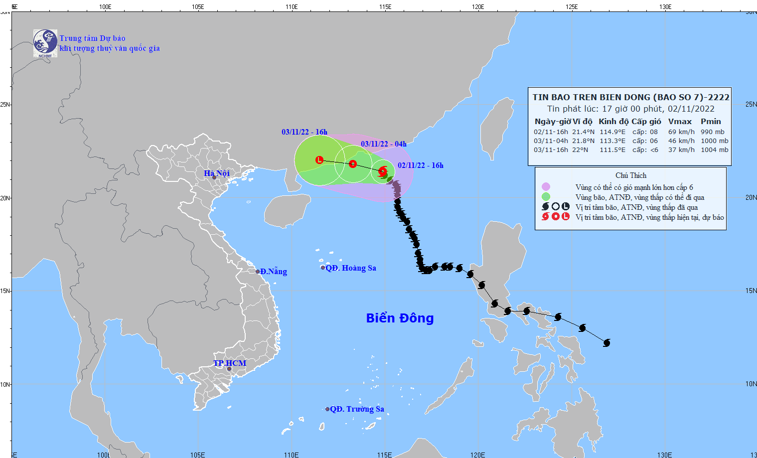 Lúc 13 giờ ngày 02/11, vị trí tâm bão ở vào khoảng 21,2 độ Vĩ Bắc. 115,0 độ Kinh Đông. Gió tiếp tục hoạt động mạnh trên khu vực Bắc Biển Đông.