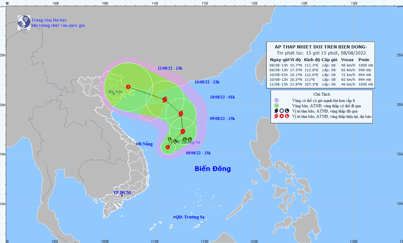 Dải hội tụ nhiệt đới có trục đi qua khu vực Bắc Trung Bộ nối với áp thấp nhiệt đới có vị trí tâm ở vào khoảng 15,7 độ Vĩ Bắc - 111,3 độ Kinh Đông lúc 13 giờ ngày 08/8.