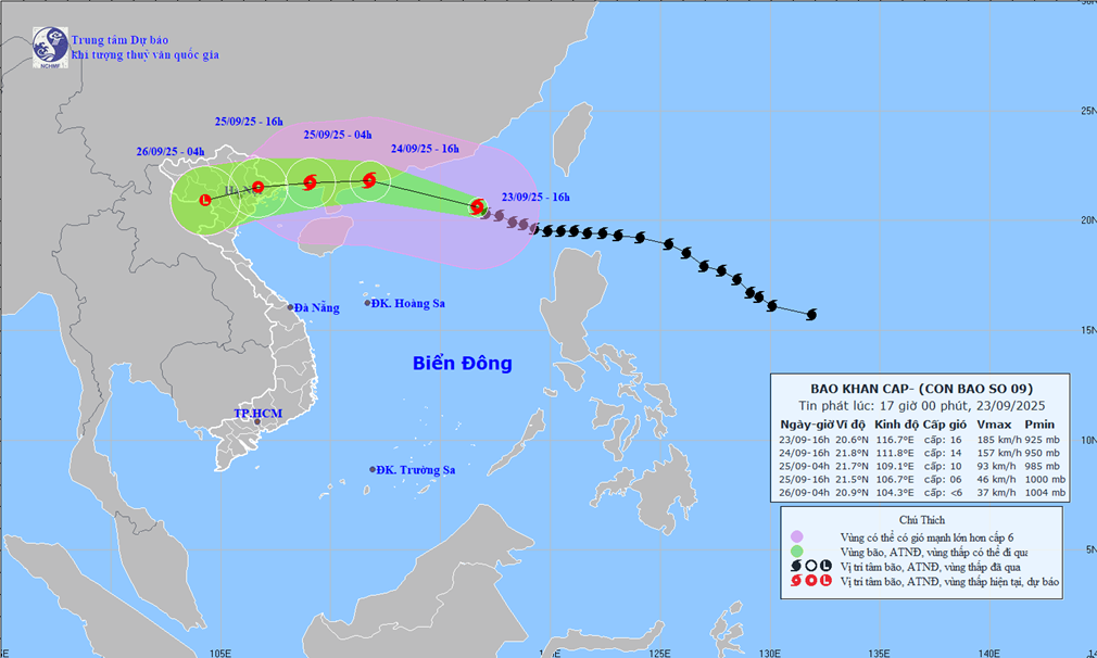 Hồi 13 giờ ngày 23/9, vị trí tâm siêu bão số 9 ở vào khoảng 20,3 độ Vĩ Bắc. 117,1 độ Kinh Đông. Gió trên hầu khắp các vùng biển hoạt động với cường độ trung bình. Riêng phía Đông khu vực Bắc Biển Đông có gió mạnh và mưa bão.