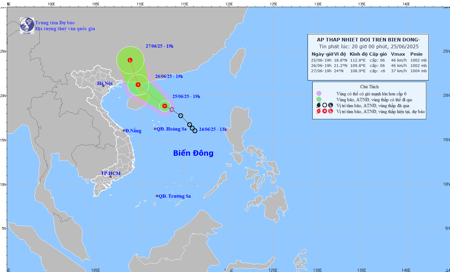 Hồi 13h vị trí tâm áp thấp nhiệt đới ở vào khoảng 18,4 độ Vĩ Bắc.113,6 độ Kinh Đông. Gió trên hầu khắp các vùng biển hoạt động với cường độ trung bình đến mạnh.