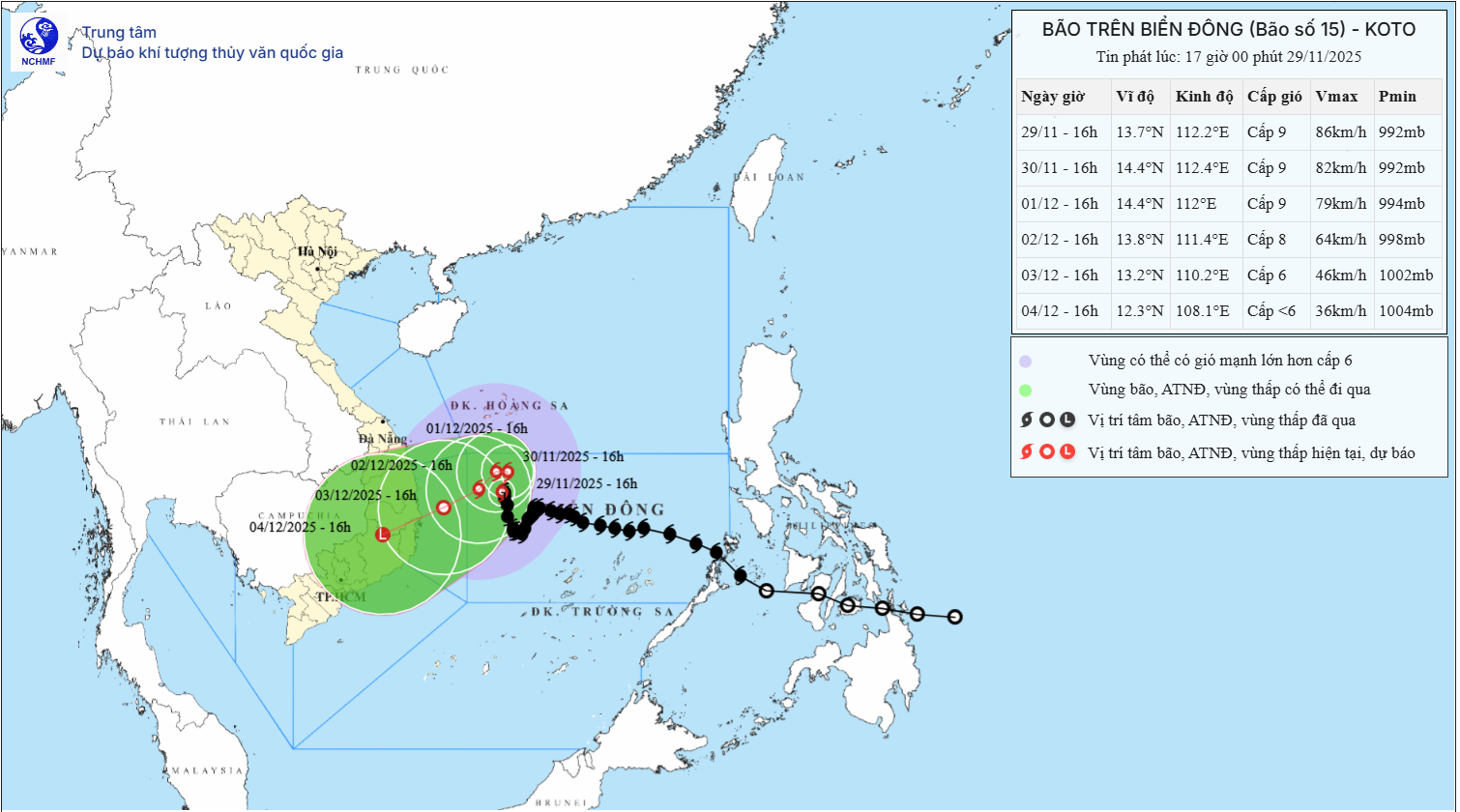 Gió hoạt động mạnh trên hầu khắp khu vực Biển Đông, vùng biển từ Nam Quảng Trị đến Khánh Hòa. Hồi 13 giờ ngày 29/11, vị trí tâm bão số 15 ở vào khoảng 13,7 độ Vĩ Bắc. 112,3 độ Kinh Đông.