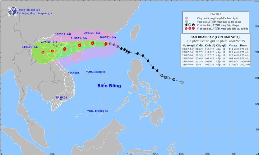 Gió Tây Nam hoạt động với cường độ mạnh trên khu vực Biển Đông và vùng biển từ Lâm Đồng đến TP. Hồ Chí Minh. Lúc 01 giờ, vị trí cơn bão số 3 ở vào khoảng 21.6 độ Vĩ Bắc, 116.1 độ Kinh Đông.