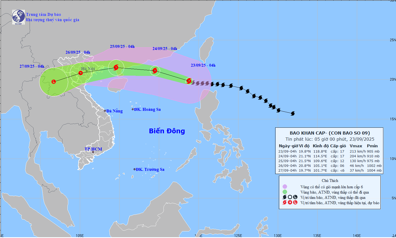 Hồi 01 giờ ngày 23/9, vị trí tâm bão số 9 ở vào khoảng 19,6 độ Vĩ Bắc. 119,3 độ Kinh Đông gây gió mạnh và mưa bão cho khu vực Bắc Biển Đông.