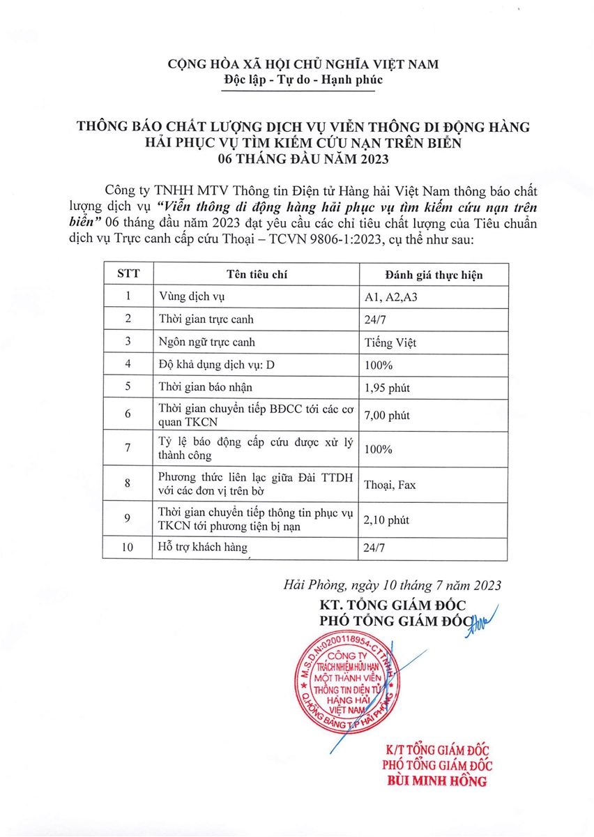 Thông báo chất lượng dịch vụ viễn thông di động hàng hải phục vụ thông tin liên lạc 06 tháng đầu năm 2024