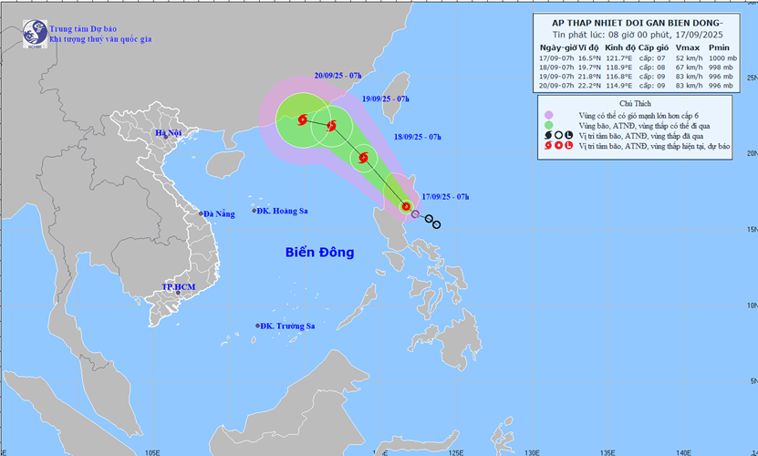 Hồi 07 giờ ngày 17/9, vị trí tâm áp thấp nhiệt đới ở vào khoảng 16,5 độ Vĩ Bắc. 121,7 độ Kinh Đông, trên khu vực phía Bắc đảo Lu-Dông (Phi-líp-pin). Sức gió mạnh nhất vùng gần tâm áp thấp nhiệt đới mạnh cấp 7 (50-61km/giờ), giật cấp 9. Di chuyển theo hướng Tây Bắc với tốc độ khoảng 15km/h.