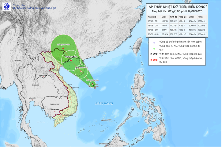 Hồi 01 giờ ngày 17/8, vị trí tâm áp thấp nhiệt đới ở vào khoảng 16,7 độ Vĩ Bắc. 112,3 độ Kinh Đông. Sức gió mạnh nhất vùng gần tâm áp thấp nhiệt đới mạnh cấp 6 (39-49km/h), giật cấp 8. di chuyển theo hướng Tây Bắc với tốc độ khoảng 10km/h.