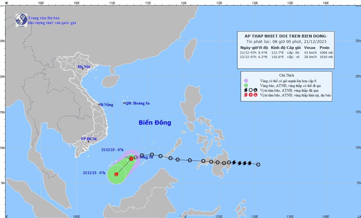 Hồi 07 giờ ngày 21/12, vị trí tâm áp thấp nhiệt đới ở vào khoảng 8,4 độ Vĩ Bắc; 112,7 độ Kinh Đông, trên khu vực quần đảo Trường Sa. Sức gió mạnh nhất vùng gần tâm áp thấp nhiệt đới mạnh cấp 6 (39-49km/h), giật cấp 8, di chuyển theo hướng Tây Nam 15km/h.