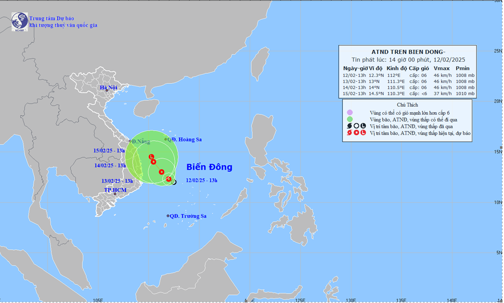- Thời điểm dự báo: 13 giờ ngày 13/02: Hướng Tây Bắc, tốc độ khoảng 5 km/h. Vị trí: 13,0 N-111,3E. trên vùng biển phía Tây khu vực Giữa Biển Đông. Cường độ: cấp 6, giật cấp 8. Vùng nguy hiểm: 11,0N-14,5N. 110,0E-113,5E. Cấp độ rủi ro thiên tai: cấp 3. Khu vực chịu ảnh hưởng: Phía Tây khu vực Giữa Biển Đông. vùng biển ngoài khơi từ Bình Định đến Khánh Hòa