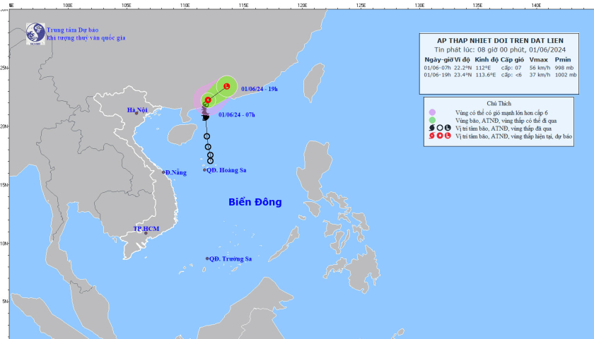 Hồi 07 giờ ngày 01/6, vị trí tâm áp thấp nhiệt đới ở vào khoảng 22,2 độ Vĩ Bắc. 112,0 độ Kinh Đông, trên đất liền phía Nam tỉnh Quảng Đông (Trung Quốc). Sức gió mạnh nhất vùng gần tâm áp thấp nhiệt đới mạnh cấp 6-7 (39-61km/h), giật cấp 9. di chuyển theo hướng Đông Bắc với tốc độ 10-15km/h.