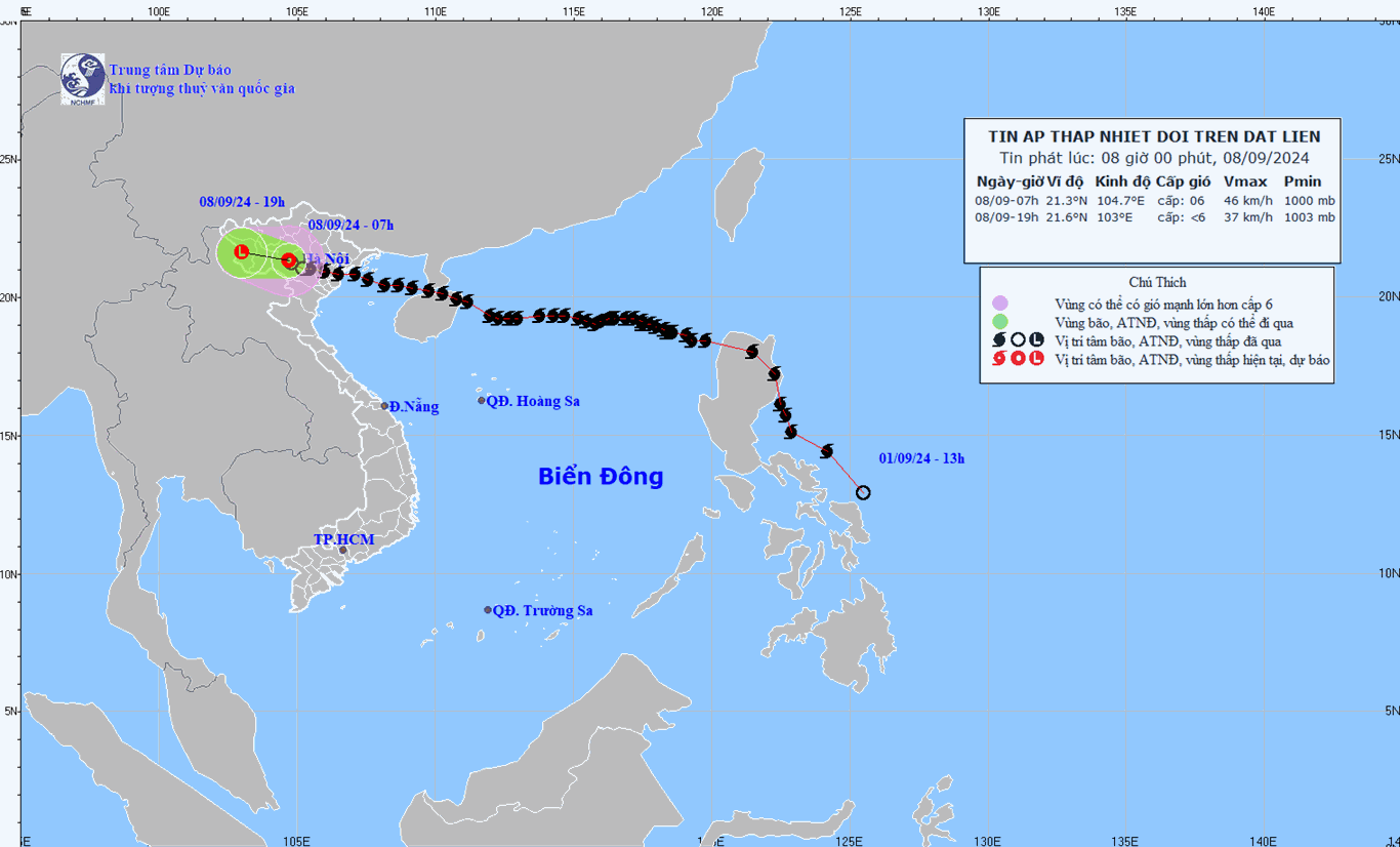 Hồi 07 giờ ngày 08/9, vị trí tâm áp thấp nhiệt đới ở vào khoảng 21,3 độ Vĩ Bắc. 104,7 độ Kinh Đông, trên đất liền khu vực phía Tây Bắc Bộ. Sức gió mạnh nhất vùng gần tâm áp thấp nhiệt đới mạnh cấp 6 (39-49km/h), giật cấp 7, di chuyển theo hướng Tây, tốc độ 10-15km/h.