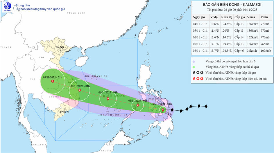 - Thời điểm dự báo: 01 giờ ngày 05/11: Hướng Tây Tây Bắc, tốc độ 20-25km/h. Vị trí: 11,4N-120,0E. trên khu vực phía Tây miền Trung (Phi-líp-pin). Cường độ: cấp 12-13, giật cấp 16. Vùng nguy hiểm: Vĩ tuyến 10,0N-13,0N. phía Đông kinh tuyến 118,0E. Cấp độ rủi ro thiên tai: cấp 3. Khu vực chịu ảnh hưởng: vùng biển phía Đông khu vực Giữa Biển Đông