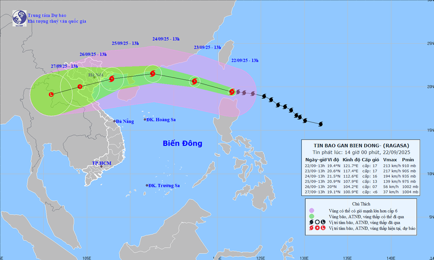 Hồi 13 giờ ngày 22/9, vị trí tâm siêu bão RAGASA ở vào khoảng 19,4 độ Vĩ Bắc; 121,7 độ Kinh Đông, cách đảo Lu-Dông (Philippin) khoảng 140km về phía Bắc. Sức gió mạnh nhất vùng gần tâm siêu bão mạnh cấp 17 (202-221km/giờ), giật trên cấp 17. Di chuyển theo hướng Tây Tây Bắc với tốc độ 20-25km/h.