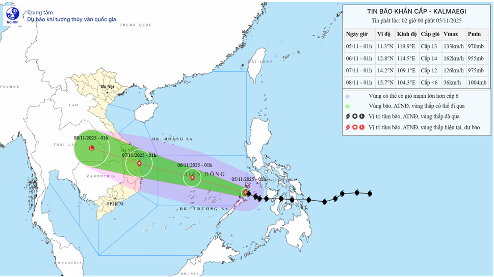 Tin bão khẩn cấp - Cơn bão KALMAEGI (Tin phát lúc 02h00 ngày 05/11/2025)