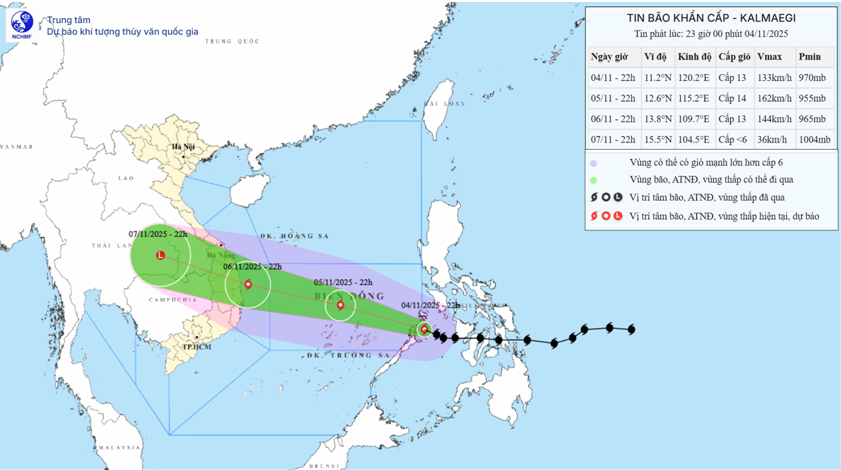 Hồi 22 giờ ngày 04/11, vị trí tâm bão ở vào khoảng 11,2 độ Vĩ Bắc. 120,2 độ Kinh Đông, trên vùng biển phía Tây khu vực miền Trung Phi-líp-pin, cách đảo Song Tử Tây khoảng 650km về phía Đông. Sức gió mạnh nhất vùng gần tâm bão mạnh cấp 13 (134-149 km/giờ), giật cấp 16. Di chuyển theo hướng Tây Tây Bắc với tốc độ 20-25km/h.