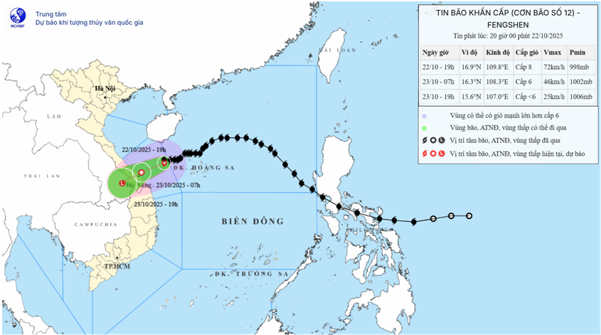 Do ảnh hưởng của hoàn lưu bão số 12 kết hợp với không khí lạnh tăng cường mạnh, từ tối và đêm 22/10 trên đất liền ven biển các tỉnh từ Quảng Trị đến Tp. Đà Nẵng có Gió mạnh dần lên cấp 5, có nơi 6, giật cấp 8.