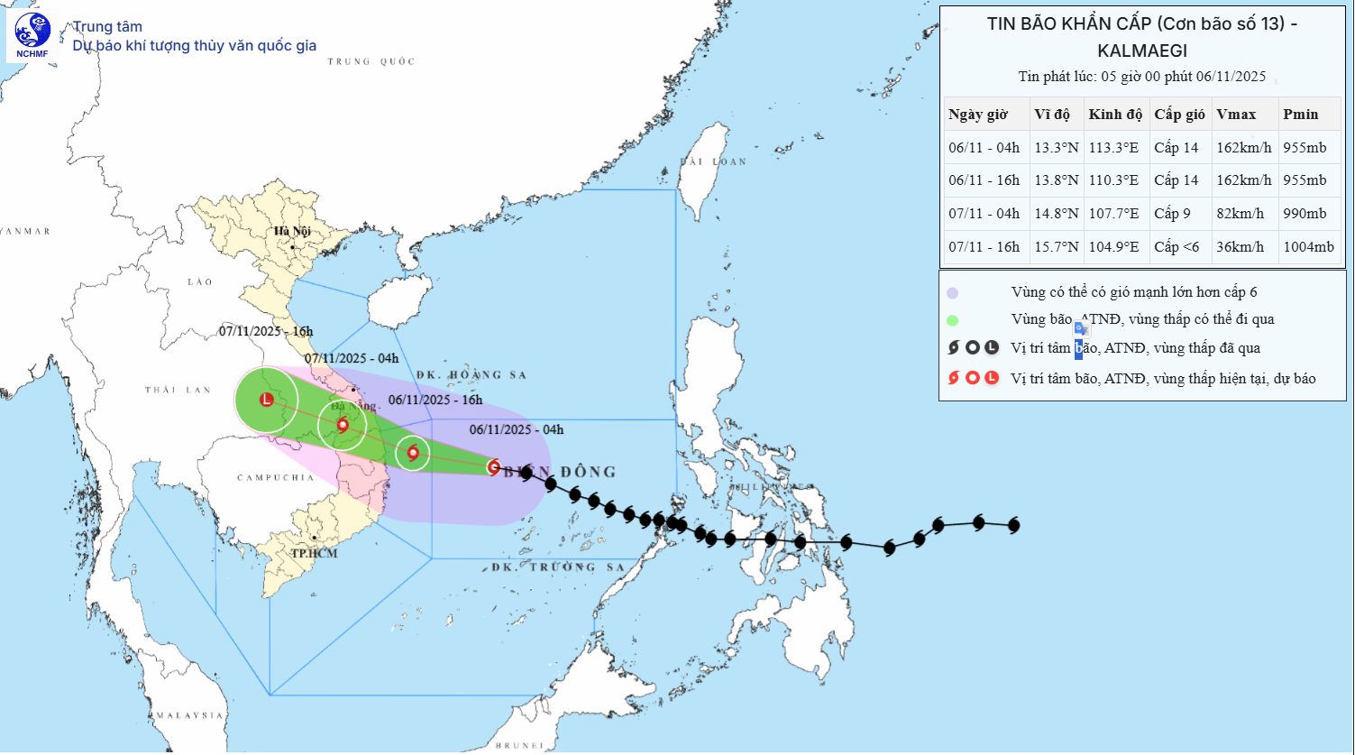- Thời điểm dự báo: 13 giờ ngày 06/11: Hướng Tây Tây Bắc, tốc độ 25-30km/h. Vị trí: 13,9N-111,3E. cách Quy Nhơn (Gia Lai) khoảng 230km về phía Đông. Cường độ: cấp 14, giật cấp 17. Vùng nguy hiểm: Vĩ tuyến 11,5N-16,0N. Kinh tuyến 110,0E-116,5E. Cấp độ rủi ro thiên tai: cấp 4. Khu vực chịu ảnh hưởng: Khu vực Giữa Biển Đông, vùng biển ngoài khơi từ Quảng Ngãi đến Đắk Lắk