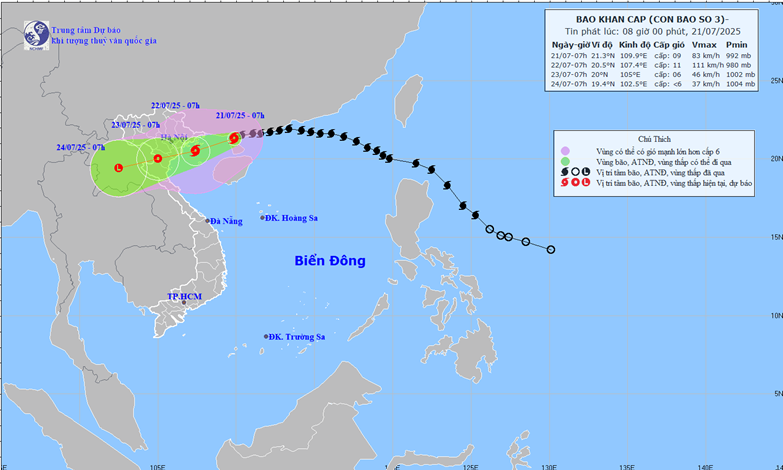 Từ ngày 21/7 đến ngày 23/7, ở khu vực Đông Bắc, đồng bằng Bắc Bộ, Thanh Hóa và Nghệ An có mưa to đến rất to và dông với lượng mưa phổ biến 200-350mm, cục bộ có nơi trên 600mm; các nơi khác ở khu vực Bắc Bộ và Hà Tĩnh có mưa vừa, mưa to, cục bộ có nơi mưa rất to và dông với lượng mưa phổ biến 100-200mm, cục bộ có nơi trên 300mm. Cảnh báo nguy cơ mưa có cường suất lớn (>150mm/3h). Lượng mưa lớn trong thời gian ngắn có thể gây lũ quét, sạt lở đất ở vùng núi, ngập lụt ở vùng trũng thấp.