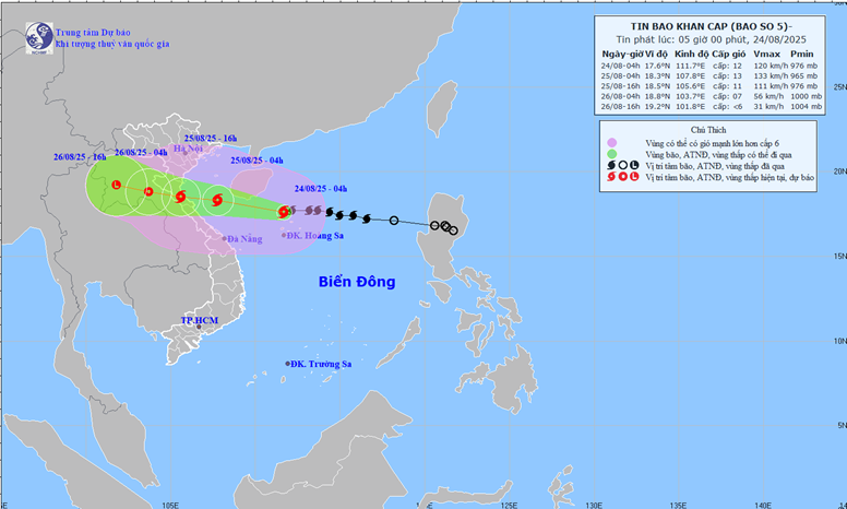 - Thời điểm dự báo: 04 giờ ngày 25/8. hướng Tây Tây Bắc, tốc độ khoảng 20km/h. Vị trí: 18,3N-107,8E; trên khu vực Nam Vịnh Bắc Bộ; cách Nghệ An khoảng 230km, cách Hà Tĩnh khoảng 210km về phía Đông. Cường độ: 12-13, giật 15; và còn có thể mạnh thêm. Vùng nguy hiểm: Vĩ tuyến 16,0N-20,0N; kinh tuyến 106,5E-114,5E. Cấp độ rủi ro thiên tai: cấp 3. Khu vực chịu ảnh hưởng: Vùng biển phía Tây khu vực Bắc Biển Đông (bao gồm đặc khu Hoàng Sa), vịnh Bắc Bộ, vùng biển Nam Quảng Trị-Tp. Huế (bao gồm đảo Hòn Ngư, đặc khu Cồn Cỏ)