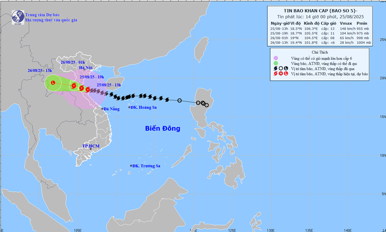 Hồi 13 giờ ngày 25/8, vị trí tâm bão ở vào khoảng 18,5 độ Vĩ Bắc. 106,3 độ Kinh Đông, trên vùng biển ven bờ khu vực Nghệ An-Hà Tĩnh. Sức gió mạnh nhất vùng gần tâm bão mạnh cấp 13 (134-149km/giờ), giật cấp 16. di chuyển theo hướng Tây Tây Bắc với tốc độ 15-20km/giờ.