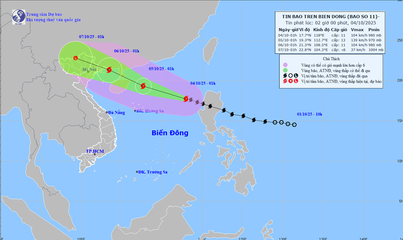 Tin bão trên biển Đông - Cơn bão số 11 (Tin phát lúc 02h00 ngày 04/10/2025)