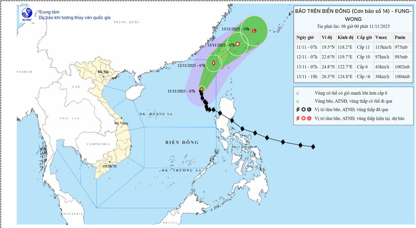Hồi 07 giờ ngày 11/11, vị trí tâm bão ở vào khoảng 19,5 độ Vĩ Bắc. 118,2 độ Kinh Đông, trên vùng biển phía Đông khu vực Bắc Biển Đông. Sức gió mạnh nhất vùng gần tâm bão mạnh cấp 11 (103-117km/giờ), giật cấp 14. Di chuyển theo hướng Bắc Tây Bắc, tốc độ khoảng 10-15km/h.