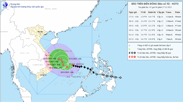 Hồi 01 giờ ngày 27/11, vị trí tâm bão ở vào khoảng 12,9 độ Vĩ Bắc; 114,7 độ Kinh Đông, cách đảo Song Tử Tây khoảng 170km về phía Bắc Đông Bắc. Sức gió mạnh nhất vùng gần tâm bão mạnh cấp 11 (103-117km/h), giật cấp 14. Di chuyển theo hướng Tây Tây Bắc, tốc độ 15-20km/h.