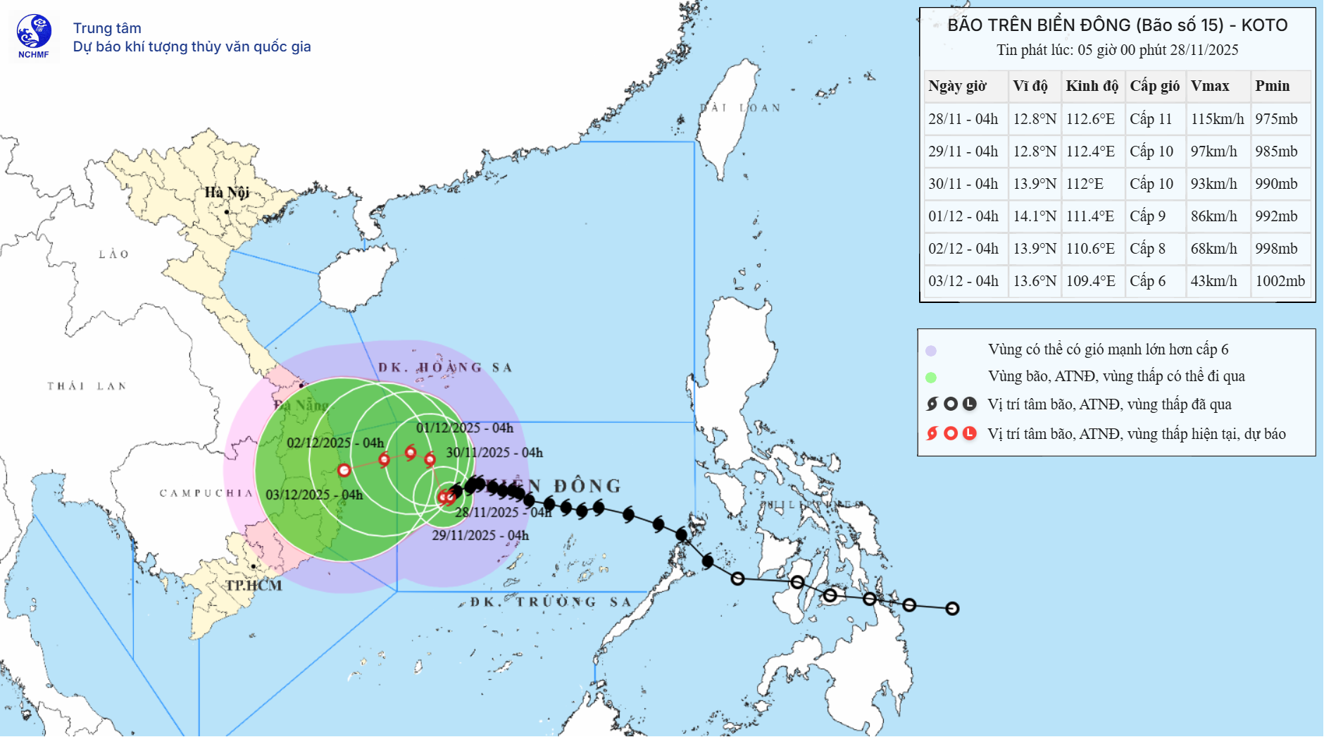 Hồi 04 giờ ngày 28/11, vị trí tâm bão ở vào khoảng 12,8 độ Vĩ Bắc. 112,6 độ Kinh Đông, cách đảo Song Tử Tây khoảng 240km về phía Tây Bắc. Sức gió mạnh nhất vùng gần tâm bão mạnh cấp 11 (103-117km/h), giật cấp 14. Di chuyển theo hướng Tây Tây Nam, tốc độ 5km/h.
