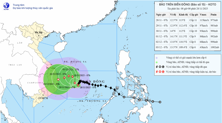 Hồi 07 giờ ngày 28/11, vị trí tâm bão ở vào khoảng 12,5 độ Vĩ Bắc. 113,0 độ Kinh Đông, cách đảo Song Tử Tây khoảng 190km về phía Tây Bắc. Sức gió mạnh nhất vùng gần tâm bão mạnh cấp 10-11 (89-117km/h), giật cấp 14. Di chuyển theo hướng Tây Nam, tốc độ 5km/h.