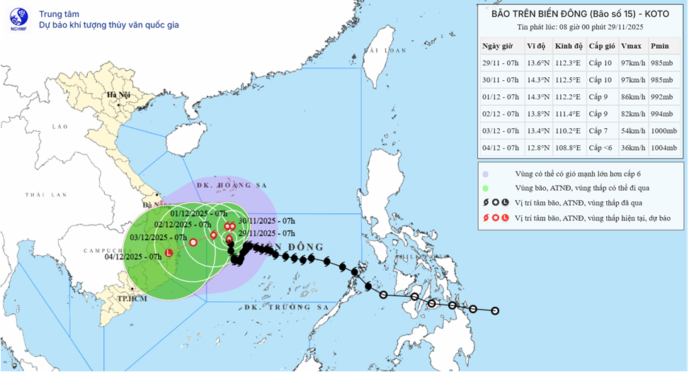 Hồi 07 giờ ngày 29/11, vị trí tâm bão ở vào khoảng 13,6 độ Vĩ Bắc. 112,3 độ Kinh Đông, cách đảo Song Tử Tây khoảng 320km về phía Tây Bắc. Sức gió mạnh nhất vùng gần tâm bão mạnh cấp 9-10 (75-102km/h), giật cấp 13. Di chuyển theo hướng Bắc, tốc độ khoảng 5km/h.