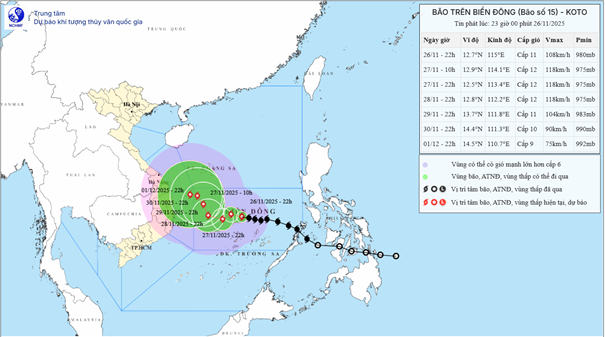 Hồi 22 giờ ngày 26/11, vị trí tâm bão ở vào khoảng 12,7 độ Vĩ Bắc. 115,0 độ Kinh Đông, cách đảo Song Tử Tây khoảng 170km về phía Bắc Đông Bắc. Sức gió mạnh nhất vùng gần tâm bão mạnh cấp 11 (103-117km/h), giật cấp 14. Di chuyển theo hướng Tây Tây Bắc, tốc độ 15-20km/h.