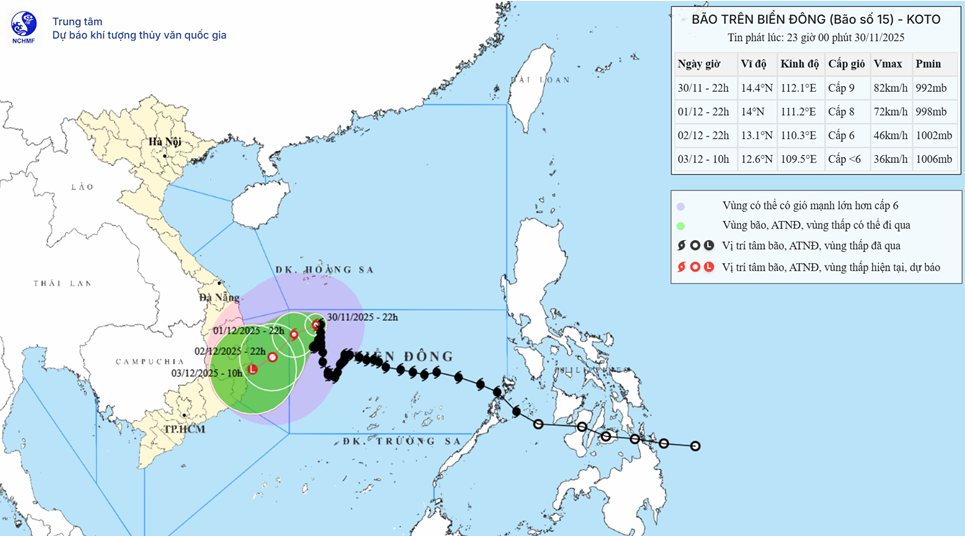 Tin bão trên biển Đông - Cơn bão số 15 (Tin phát lúc 23h00 ngày 30/11/2025)
