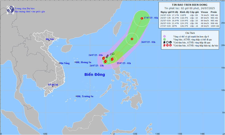 - Thời điểm dự báo: 01 giờ ngày 25/7: Hướng Đông Đông Bắc, tốc độ 10-15 km/h. Vị trí: 16,9N-119,9E. trên vùng biển phía Đông của Bắc Biển Đông. Cường độ: cấp 9-10, giật cấp 12. Vùng nguy hiểm: 15,0N-19,5N. phía Đông kinh tuyến 116,5E. Cấp độ rủi ro thiên tai: cấp 3. Khu vực chịu ảnh hưởng: vùng biển phía Đông khu vực Bắc Biển Đông.