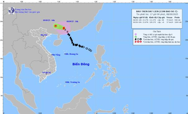 Hồi 16 giờ ngày 08/9, vị trí tâm bão ở vào khoảng 23,2 độ Vĩ Bắc; 111,4 độ Kinh Đông, trên đất liền phía Tây Nam tỉnh Quảng Đông (Trung Quốc). Sức gió mạnh nhất vùng gần tâm bão mạnh cấp 8 (62-74km/giờ), giật cấp 10. Di chuyển theo hướng Tây Bắc, tốc độ 20-25km/giờ.