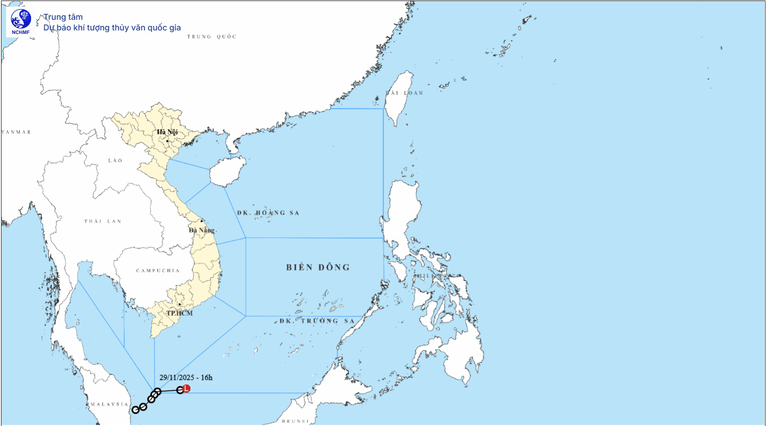 Chiều nay (29/11), áp thấp nhiệt đới đã suy yếu thành một vùng áp thấp trên vùng biển phía Tây Nam khu vực Nam Biển Đông.