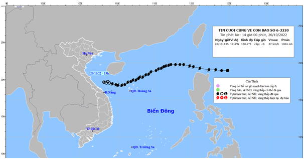 Chiều nay (20/10), áp thấp nhiệt đới (suy yếu từ bão số 6) đã suy yếu thành một vùng áp thấp trên vùng biển Quảng Bình đến Thừa Thiên Huế.