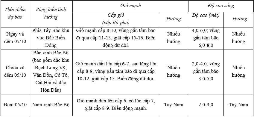 📍 Cảnh báo: Ngày 06/10, khu vực Bắc vịnh Bắc Bộ (bao gồm đặc khu Bạch Long Vỹ, Vân Đồn, Cô Tô, Cát Hải và đảo Hòn Dấu) gió mạnh cấp 6-7, vùng gần tâm bão cấp 8-9, giật cấp 12; sóng biển cao 2,0-3,0m; vùng gần tâm bão đi qua 3,0-4,0m; biển động rất mạnh.