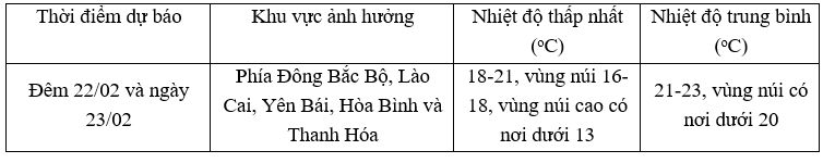 Từ ngày 23/02, ở khu vực phía Đông Bắc Bộ, Lào Cai, Yên Bái, Hòa Bình và Thanh Hóa trời chuyển lạnh, vùng núi có nơi rét trời rét. Trong đợt không khí lạnh này nhiệt độ thấp nhất ở những khu vực trên phổ biến từ 17-20 độ, khu vực vùng núi Bắc Bộ từ 15-17 độ, vùng núi cao có nơi dưới 12 độ.