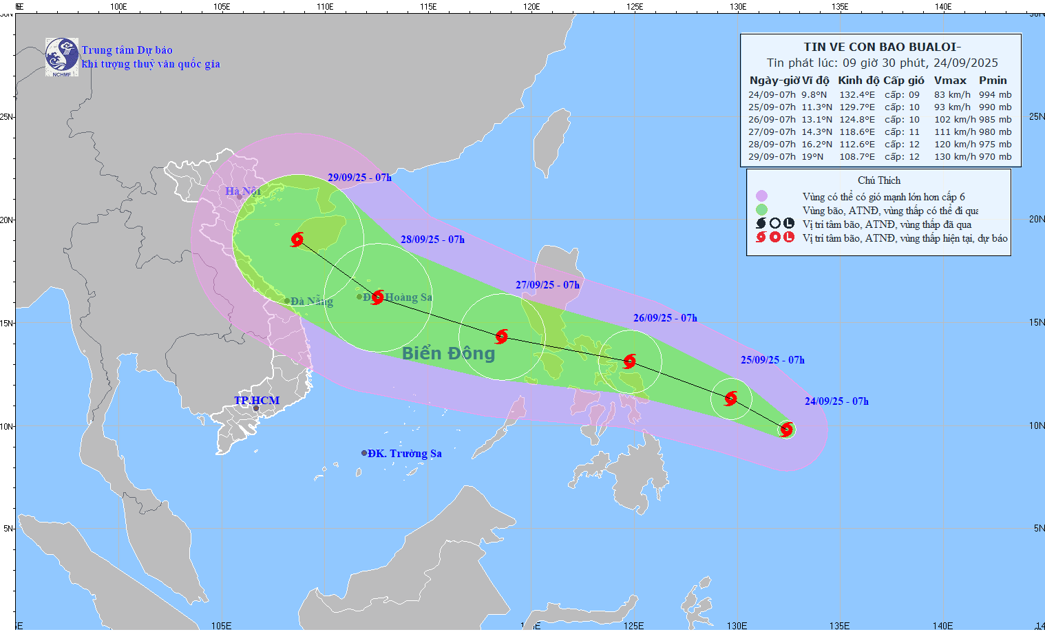 Dự báo khoảng đêm 26/9, bão BUALOI sẽ đi vào vùng biển phía Đông khu vực Giữa Biển Đông, trở thành cơn bão số 10 năm 2025.